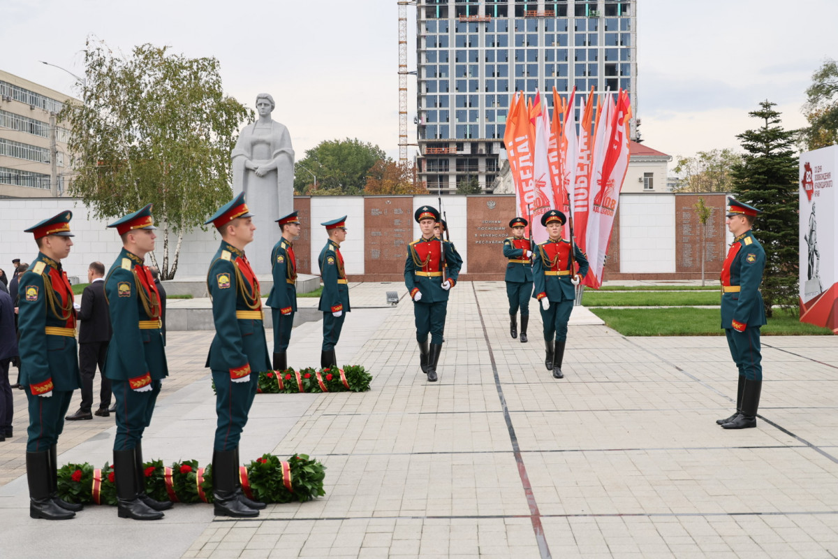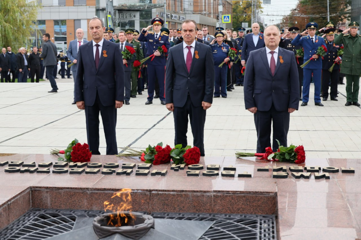 Участники церемонии возложили цветы к Вечному огню и почтили память погибших земляков в Великой Отечественной войне минутой молчания. Военнослужащие Краснодарского территориального гарнизона и казаки Почетного караула Кубанского казачьего войска прошли торжественным маршем.