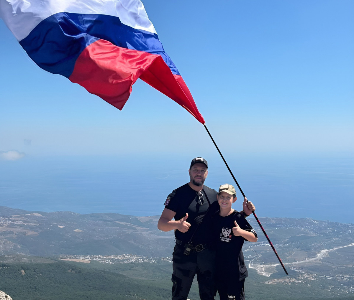 Экскурсию возглавил Алексей Волохов, выпускник школы № 29 станицы Новотитаровской, который вместе с сыном, пятиклассником Макаром водрузил российский триколор над вершиной горного массива.