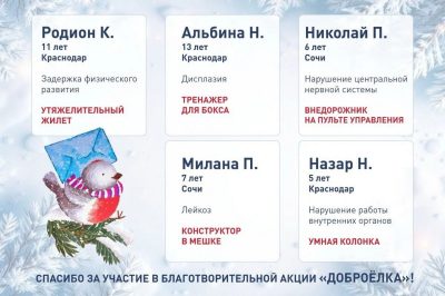 – В конце года традиционно проходит очень светлая и теплая акция «Доброелка» от благотворительного фонда «Край добра». Утром принял в ней участие и исполнил новогодние желания наших мальчишек и девчонок. Это детки с тяжелыми заболеваниями, которые каждый день борются за жизнь, поэтому им так необходимы наша поддержка и внимание. Исполнить желание может каждый: ребята мечтают о простых вещах. Например, Назар из Краснодара хотел умную колонку, Милана – конструктор в мешке, а Николай из Сочи – внедорожник на пульте управления. Сделать все это можно онлайн на официальном сайте акции, что очень удобно, а сам подарок уже доставят добровольцы. Новогодняя пора – одна из самых волшебных и долгожданных для наших детишек, поэтому важно создать для них настоящий праздник, – отметил Вениамин Кондратьев.