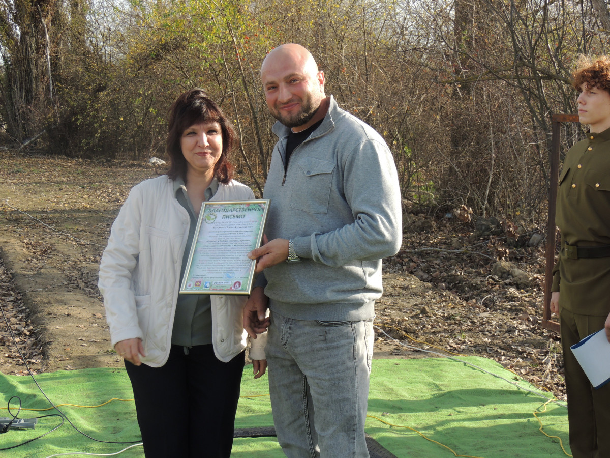 Евгений Иванов вручает благодарность Елене Кузьменко за участие в акции.
