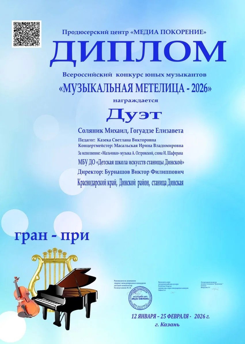 Дуэт Михаила Соляника (3-й класс) и Елизаветы Гогуадзе (5-й класс), которые обучаются по программе «хоровое пение», завоевал на конкурсе диплом гран-при!