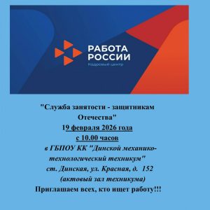 19 февраля 2026 года с 10 часов в ГБПОУ КК “Динской механико-технологический техникум” пройдет ярмарка вакансий.