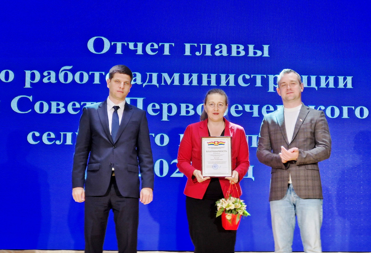 После обсуждения доклада деятельность администрации и главы Первореченского сельского поселения была признана удовлетворительной, и по сложившейся традиции сессия завершилась церемонией награждения земляков. Игорь Федосов, глава района, и Дмитрий Елисеев, депутат районного Совета, вручили Благодарность главы района Артему Суркову и Роману Землянухину. А Благодарности председателя Совета МО Динской район были удостоены Владимир Шибанов, депутат Совета, и Алеся Духнай, глава сельского поселения. В свою очередь благодарности главы Первореченского сельского поселения были вручены жителям села Первореченского Алексею Баранову, Дмитрию Курило и Анне Минко.
