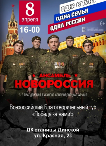 8 апреля 2026 года в 16:00 в Доме культуры станицы Динской (ул. Красная, 23) состоится благотворительный патриотический концерт в рамках Всероссийского тура «Победа за нами» (6+). Мероприятие посвящено поддержке участников специальной военной операции (СВО).